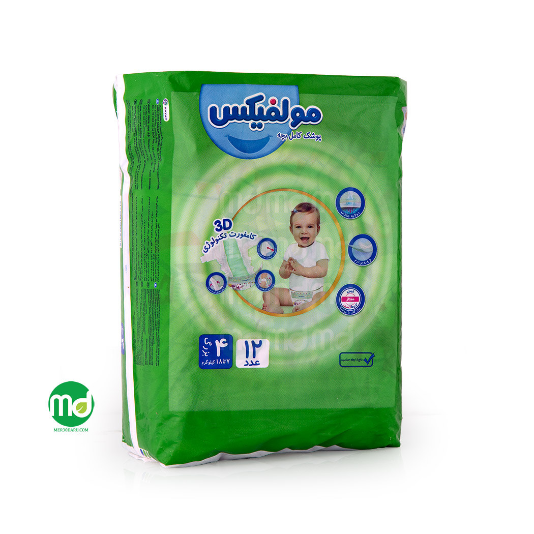 پوشک سایز 4 مولفیکس مناسب کودکان 7 تا 18 کیلو است که در بسته بندی 34 عددی می باشد. این پوشک، دارای قابلیت کشسانی فوق العاده بالا و چسب محکم و البته نرم و لطیف است که از باز شدن در هنگام فعالیت و بازی کودک جلوگیری می کند و با لایه های رویی و پشتی نرم و قابلیت عبور هوا از داخل پوشک از عرق سوختگی جلوگیری می کند.