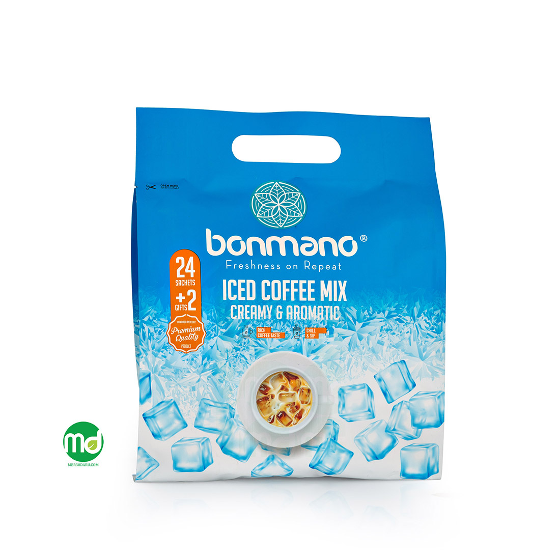 ساشه آیس کافی میکس فوری بن مانو ترکیبی از طعم قوی قهوه و استفاده از یخ یا آب سرد است که در روزهای گرم تابستان بسیار لذت بخش می باشد. آیس کافی بن مانو با 29 کالری و قند پایین یک گزینه بسیار عالی برای افرادی می باشد که به سلامتی خود اهمیت می دهند. کافئین موجود در قهوه آیس کافی میزان انرژی و هوشیاری شما عزیزان را در طول روز افزایش داده و از بهترین انتخاب ها برای علاقه مندان به قهوه سرد می باشد. استفاده راحت و آسان از ساشه های بن مانو این امکان را فراهم می آورد تا در هر زمان و مکان که دلتان نوشیدنی سرد می خواهد آن را مصرف نمایید. همچنین این محصول به حفظ رطوبت در بدن کمک کرده و از گرمازدگی جلوگیری می کند.