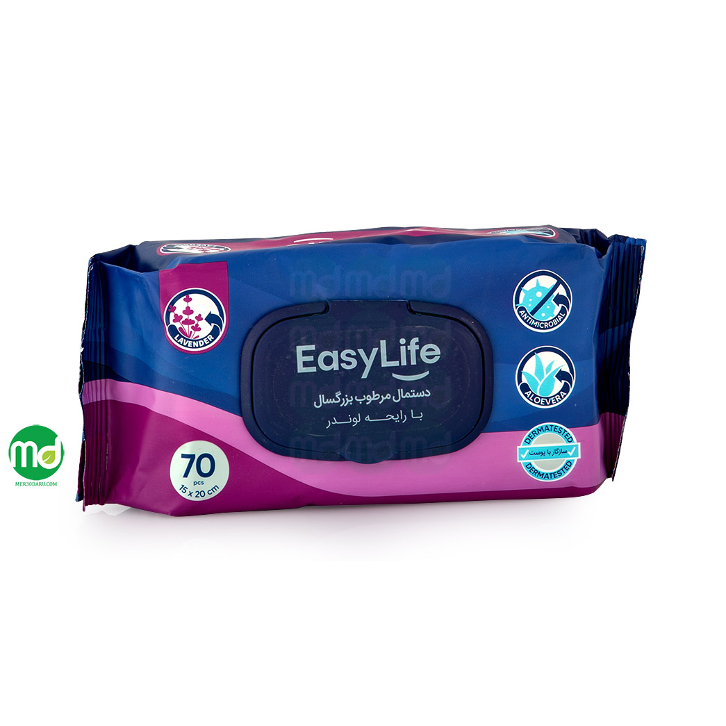 دستمال مرطوب Easy life دارای بافت و طراحی خاص خود است که آغشته به ویتامین ای و عصارهی بابونه می باشد و می توان از آن به عنوان تمیز نمودن پوست استفاده نمود که برای شستوشوی دست، صورت، بدن و نیز ناحیهی تناسلی عرضه گردیده است.