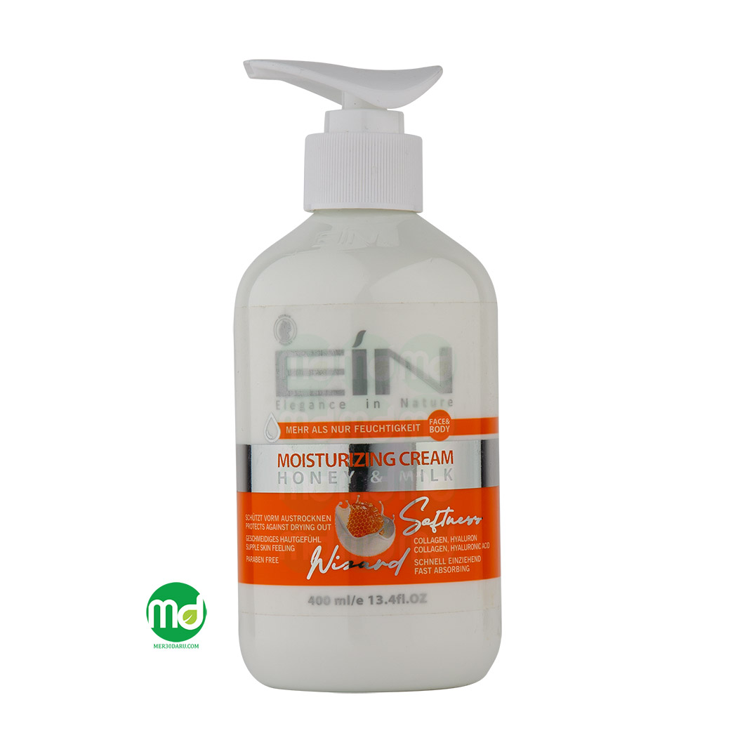 کرم شیر و عسل ای آی ان یک محصول مرطوب کننده سازگار با انواع پوست که در افزایش لطافت و شادابی پوست موثر می باشد. هیالورونیک اسید و کلاژن از ترکیبات دیگر این کرم نرم کننده می باشد که با تقویت استحکام پوست مانع از ظهور زودهنگام علائم پیری پوست می گردد. بافت این کرم به گونه ای طراحی شده است که سریعاً جذب پوست می شود و هیچ گونه احساس چربی و سنگینی برجای نمی گذارد. این ویژگی استفاده روزانه از کرم شیر و عسل EIN را بر روی پوست دست و صورت بلامانع نموده و طراوتی پایدار به پوست هدیه می دهد. اگر پوست شما به دلیل عوامل مختلفی چون شرایط آب و هوایی و یا استفاده از شوینده ها دچار خشکی شده است، استفاده از این کرم مرطوب کننده می تواند موثر باشد.